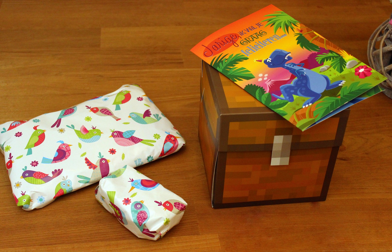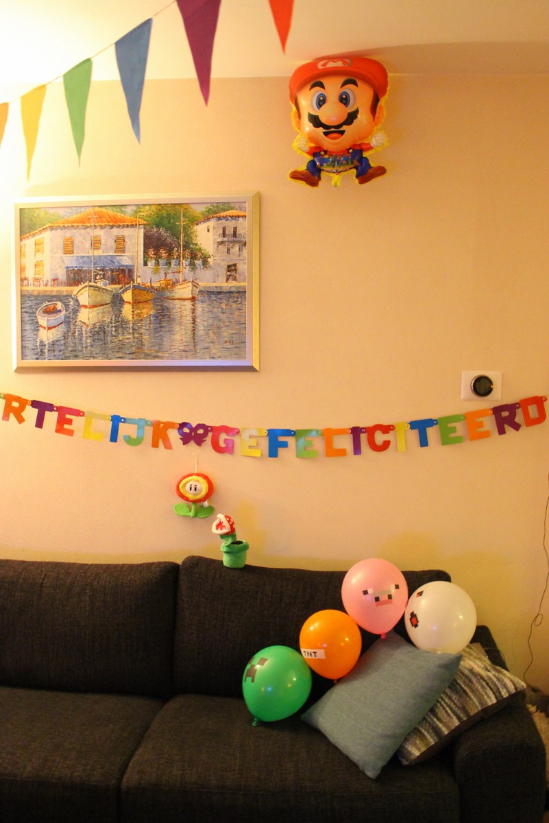 Vanavond hebben Sebas en ik de voorbereidingen getroffen voor Maarten z’n verjaardag morgen. De cadeautjes zijn ingepakt, de slingers hangen er, de minecraftballonnen zijn opgeblazen en er zit helium in de ballonnen van Super Mary (??? uhhhh…. dat staat er écht op, haha). Ook is de traktatie voor op school klaar.